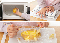 電子レンジから取り出すときは、熱いので大人が手伝って。