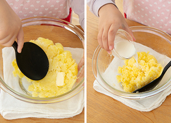 ボウルに(1)を入れてバターを加え、余熱で溶かしながら、へらなどでじゃがいもをつぶす。牛乳を加え、なめらかな状態になるまで全体を混ぜる。