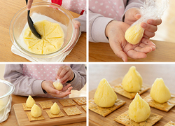 ポテトをへらなどで放射状に8等分する。ひとつ分をラップで包み、円錐形に整えてクラッカーにのせる。