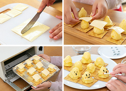 スライスチーズをテーブルナイフなどで4等分して(3)にのせる。オーブントースターで2~3分(1000Wの場合)、チーズが溶けるまで焼く。黒炒りごまやのり、ケチャップで顔を描く。