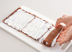 卵焼き器で焼いた四角いクレープを使って、かんたんブッシュドノエル。バタークリーム風のペーストでリッチに仕上げます。