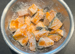 かぼちゃを厚さ1cmの食べやすい大きさに切り、片栗粉をまぶす。