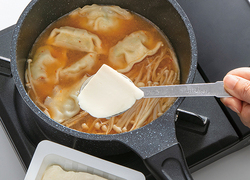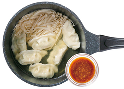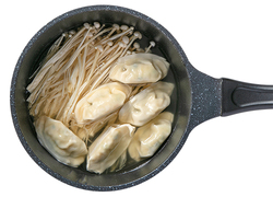 鍋に水(2カップ)と鶏ガラスープの素を入れて沸かし、凍ったままの餃子とえのき茸を入れる。