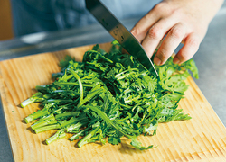 春菊は洗って、ペーパータオルでしっかりと水けをふき取る。根元にかたい部分があれば切り落とし、ざく切りにする。