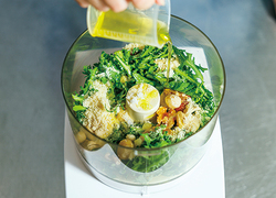 ミキサー(またはフードプロセッサーなど)に(1)の春菊、ミックスナッツ、塩、粉チーズ、オリーブオイルを入れて撹拌する。