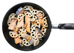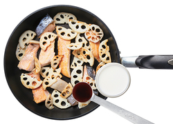 フライパンに油を熱し、凍ったままの鮭とれんこんを入れる。両面を3分ずつ、焼き目が付くまで焼く。