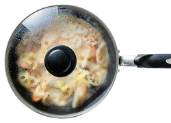 チーズをちらして再びふたをし、1分ほどチーズが溶けるまで混ぜずにそのまま加熱する。