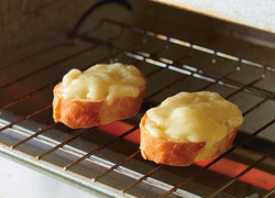 バゲットにシュレッドチーズ をのせ、オーブントースターで軽く焦げ目が付くまで焼く。(3)の上にのせて、好みで粗びき黒こしょうをふる。