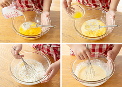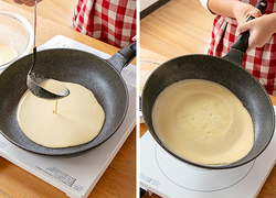 フライパン(直径22cm程度)に油をペーパータオルなどで薄く塗って中火で熱する。いったん火を止め、おたま1杯程度の生地を流し入れ、フライパンを傾けながら全体に広げる。再び弱火にかけ、表面が乾いてきたら、生地を裏返す。1分ほど焼いて取り出し、そのままさます。同様に計3枚焼く。