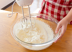 ボウルに生クリーム、砂糖を入れ、ハンドミキサーで角が立つくらいまで泡立てる。