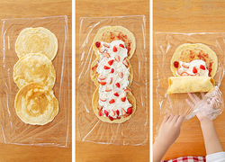 巻き終わり部分(クレープ生地の1/3程度)には、生クリームを塗らずに残しておくと、巻いたときにはみ出しにくくなります。また、重ねた生地と生地の間に生クリームを塗ると、巻くときに生地がはがれず、上手に巻けますよ。