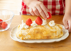 ラップを広げ、(3)を生地の端の部分が1/3程度重なるように並べて置く。ジャムを塗り、その上に生クリームをのせて広げる。いちごは全体にちらし、巻き始めの部分は芯になるように一列にいちごを並べる。ラップを持ち上げ、並べたいちごを軸にしてくるくる生地を巻く。