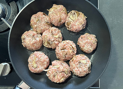 ポリ袋に豚ひき肉、Aを入れて袋の上からもむ。均一になったら、まいたけ、ねぎ、片栗粉を加え、全体が白っぽくなるまでさらにもむ。
