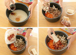 炊飯器の内釜に米を入れ、2合の目盛りまで水を注ぎ、大さじ1杯分の水を取り除く。炊飯器の内釜にBを加える。(1)、(2)を入れ、もちをのせて通常通りに炊飯する。