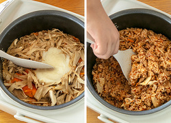 炊き上がったら、溶けたもちが全体に混ざるようにしゃもじでよく混ぜる。