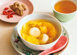 シロップ(200ml)、はっさくの実(適量)、水(120ml)を合わせて火にかけ、温めればホットスープとして楽しめます。好みで白玉を加え、クコの実や黒糖をちらせばアジアンなデザートに。