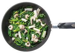 フライパンに残りの油を熱し、(1)の『エビ・イカミックス』、ほうれん草を炒める。