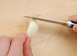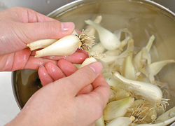 薄皮に軽く切り込みを入れることで、薄皮がはがれやすくなります。らっきょうを長時間水につけたままにすると、カリカリの食感が失われやすいので注意して。