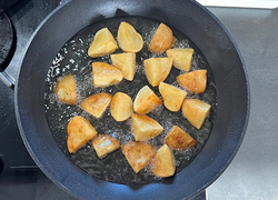 フライパン全体に広がるくらいの油を入れ、熱する。水けをふいた新じゃがいもを入れ、きつね色になるまで5~6分揚げ焼きにする。油をきって取り出し、塩をふる。