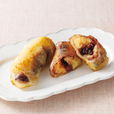春巻きの皮の長い辺を手前にして置き、バナナ、チョコレートをのせ、ふちにAを塗り、両端を折って巻く。同様に計8本作る。